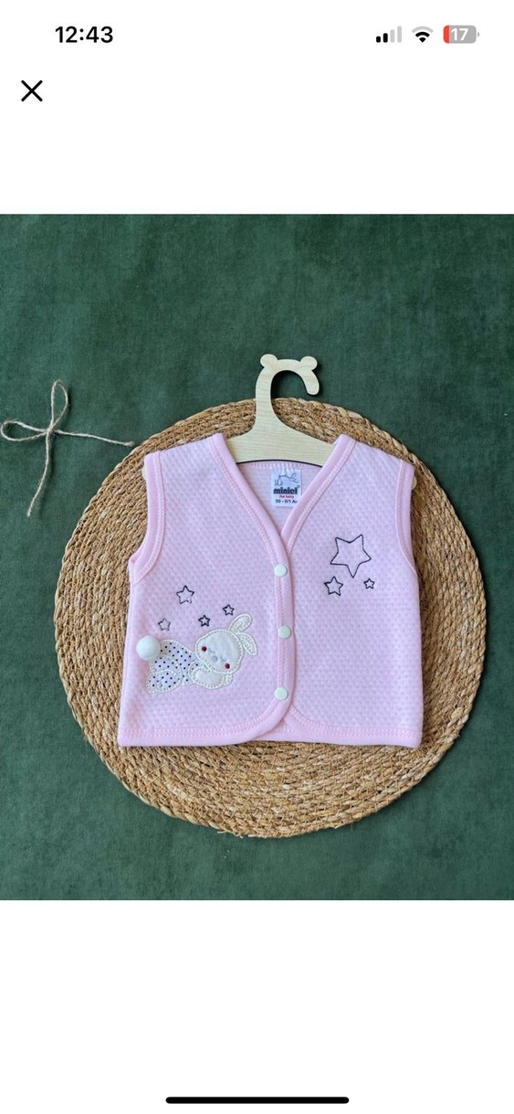 Pastel pembe renkli, V yakalı, kız çocuk yeleği. Nakışlı yıldız ve tavşan desenleriyle rahat ve basic bir model.