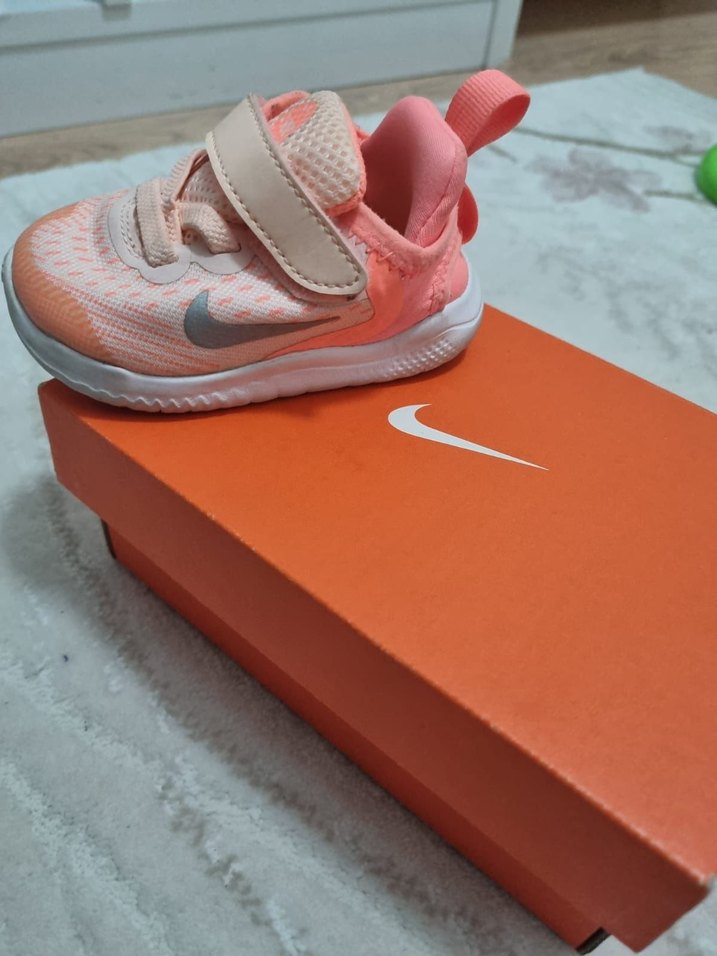 Nike marka, açık pembe renkli, baskılı desenli kız çocuk spor ayakkabısı, cırt cırtlı ve kauçuk tabanlıdır.