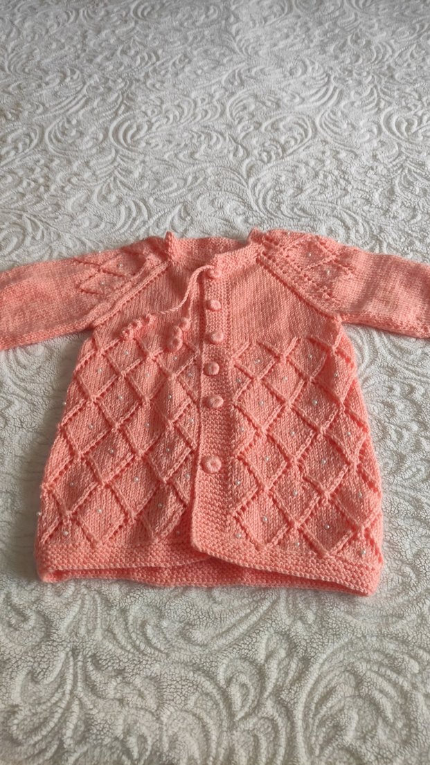 Pastel pembe renkli, uzun kollu, bol kesim ve bohem tarzı kız çocuk örgü hırka. Düğmeli ve dokulu baklava deseni bulunur.