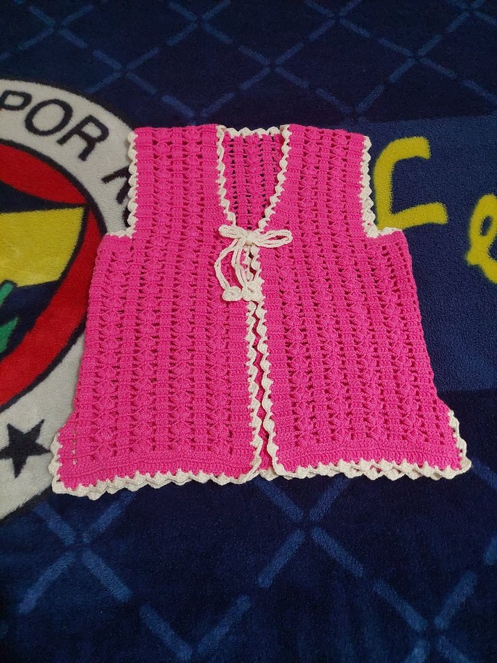 Pembe renkli, örgü malzemeden yapılmış, renkli nakış detaylı, bağcıklı bohem tarzında kız çocuk yeleği. Regular fit.