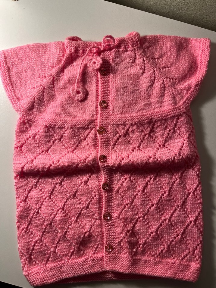 Pembe renkli, düğmeli, örgü detaylı, kolye bohem tarzda kız çocuk yeleği.