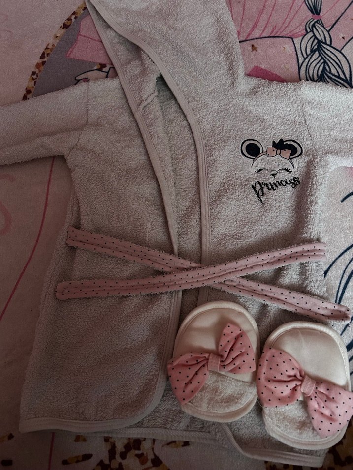 Kız çocukları için pastel pembe renkli, yumuşak örgü bornoz ve terlik seti. Bornoz kapüşonlu ve kuşaklı, üzerinde prenses işlemeli. Terlikler fiyonk detaylı.