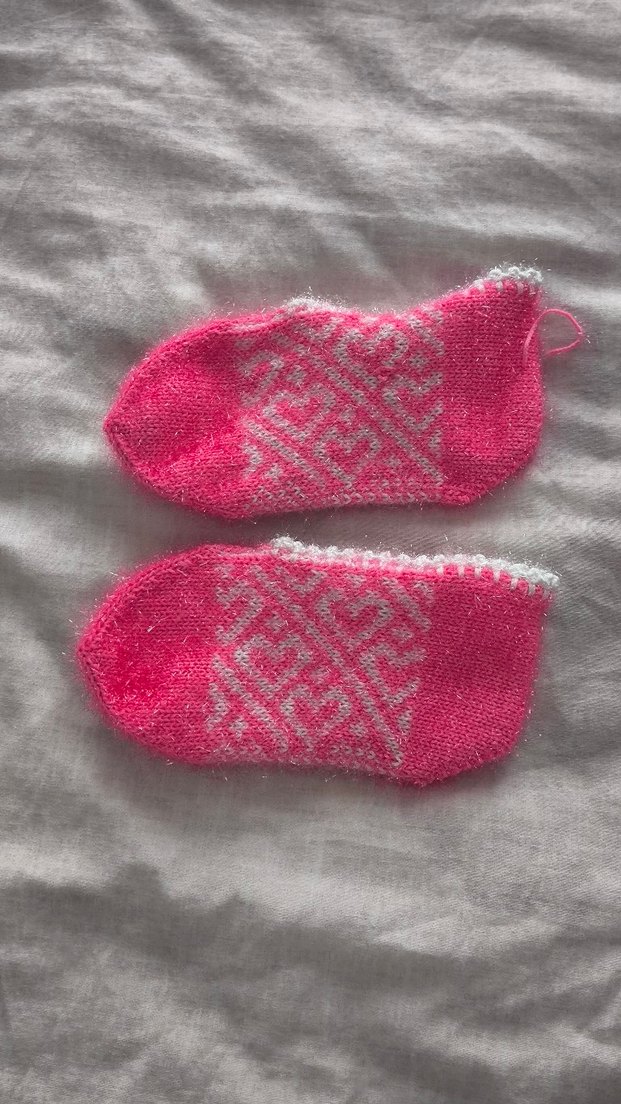 Kız çocukları için beyaz desenli pembe örgü çoraplar. Yumuşak ve rahat, günlük kullanıma uygun.