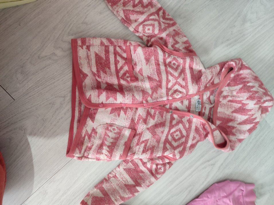 Kız çocuk için gevşek kesim, V yakalı, örgü dokulu pastel pembe desenli, yumuşak ve sıcak kumaştan yapılmış bohem tarzda ceket.