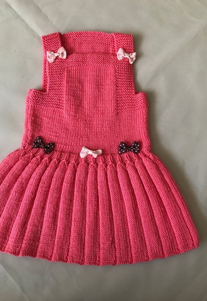 Pembe renkli, örgü kumaştan yapılmış kız çocuk elbisesi. Askısız, kolsuz ve vintage tarzda, küçük fiyonk detayları bulunur.