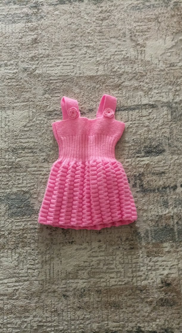Renkli pembe örme kız çocuk elbisesi, straplez yaka ve süslü askılarla, kolsuz ve vücuda oturan kesimdedir. sıfır ürün el emeği