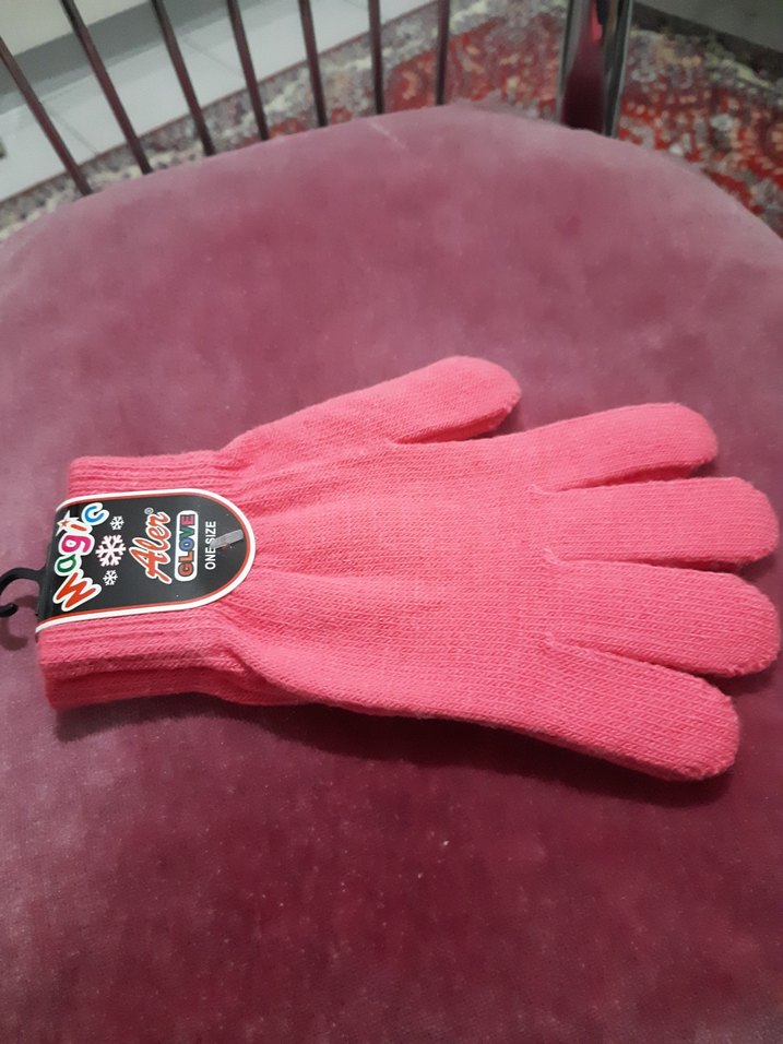 Yumuşak, sıcak kumaştan yapılmış pembe örgü kız çocuk eldiveni. Desensiz, sade ve renkli tasarım.