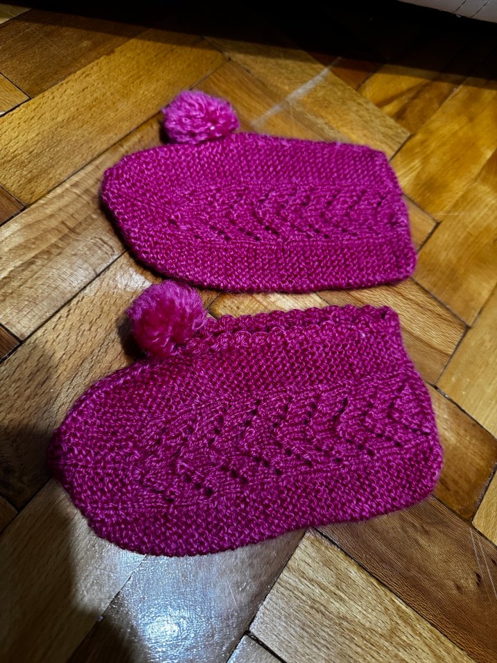 Pembe renkli, işlemeli desenlere ve ponpon detaylara sahip kız çocuk örgü ev terliği. Yumuşak ve sıcak tutar.