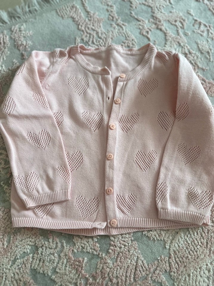 Pembe renkli, uzun kollu örgü kız çocuk hırkası, bol kesim ve kalp desenleriyle rahat bir görünüm sunar.