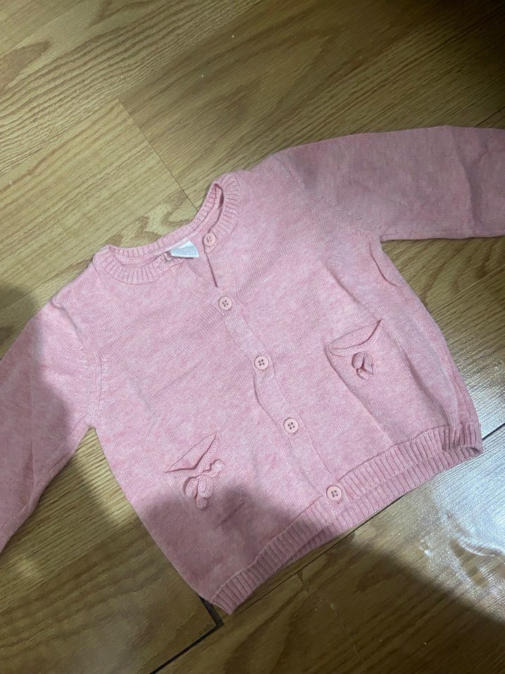 Pastel pembe renkli, uzun kollu, rahat kesim örgü kız çocuk hırkasıdır. Ceplerinde küçük fiyonk detayları bulunur.
