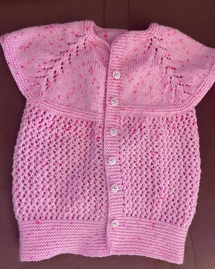 Kolsuz, pembe renkte, bohem tarzda, fitted kesim örgü kız çocuk hırkasıdır. Düğmeli ve desensizdir.