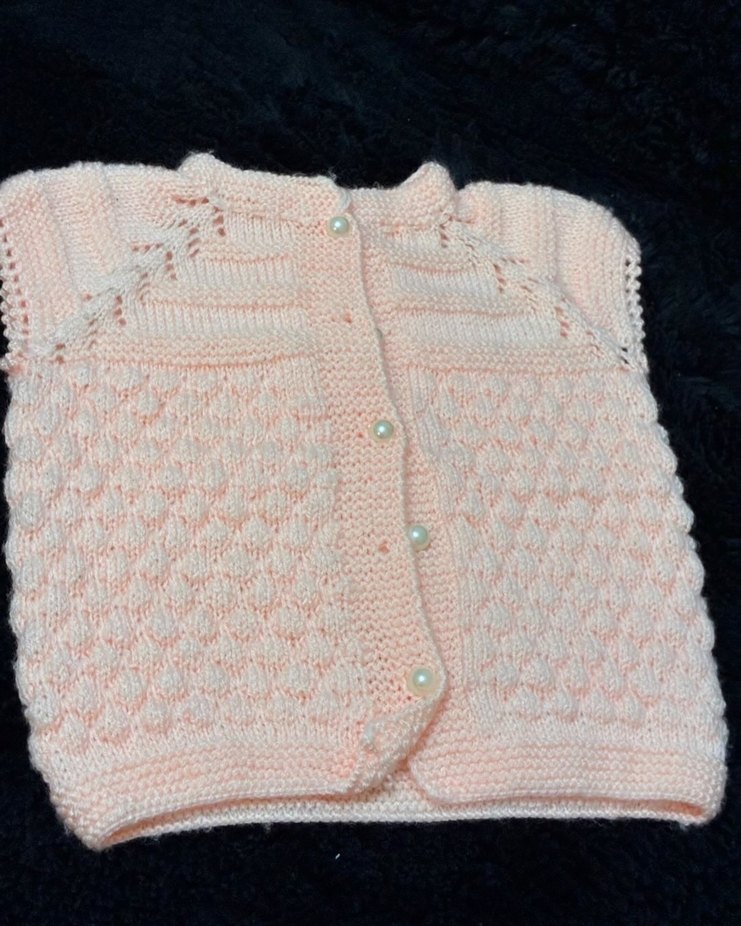 Pembe, kolsuz, örgü kız çocuk hırkası, klasik kesim ve inci düğmelerle. Yumuşak pastel tonlu, rahat bir modeldir. Ürün kendi emeğim olup hiç kullanılmamıştır