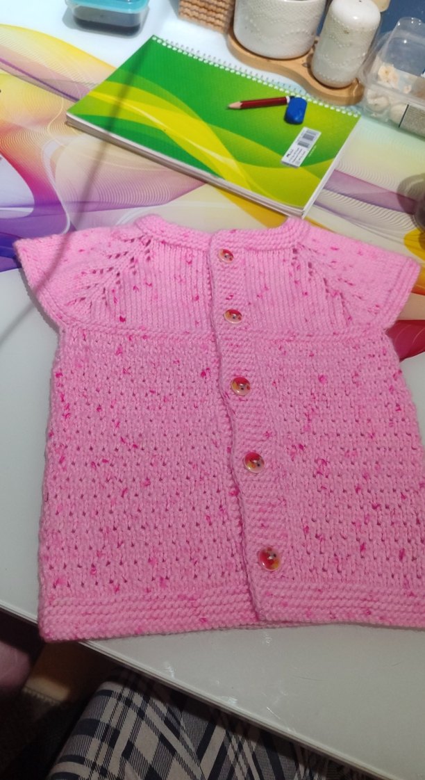 Pastel pembe renkli, kolsuz, bol kesim kız çocuk hırkası. Örgü yapıda, düğmeli ve sade bohem tarzda tasarlanmıştır.