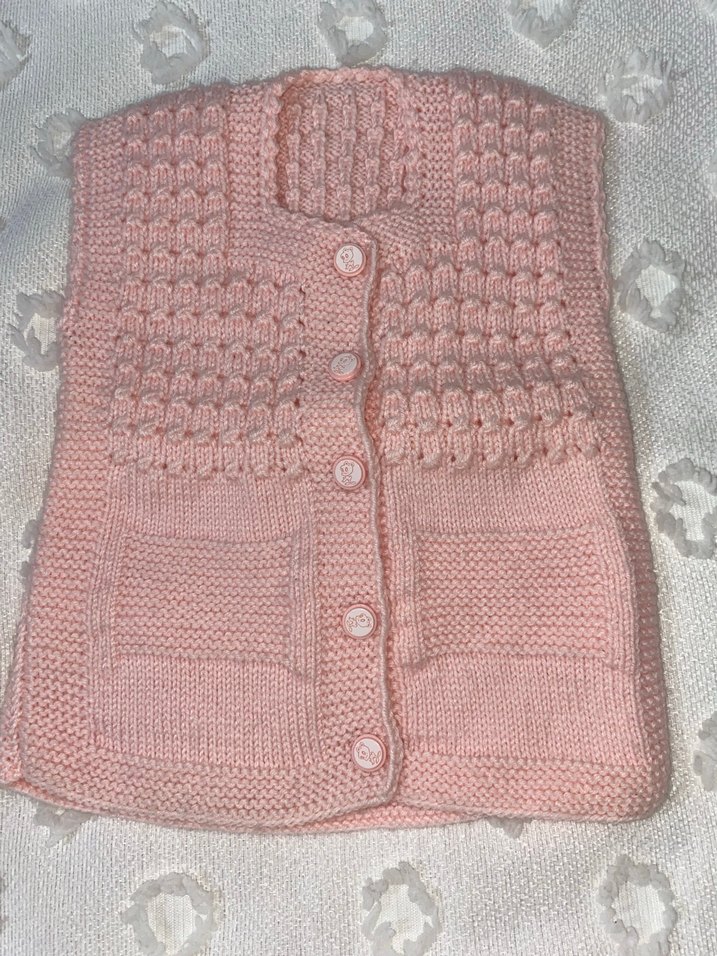 Kız çocukları için pembe, kolsuz, vintage tarzda örgü hırka. Düğmeli, cepli ve rahat kesimdir.