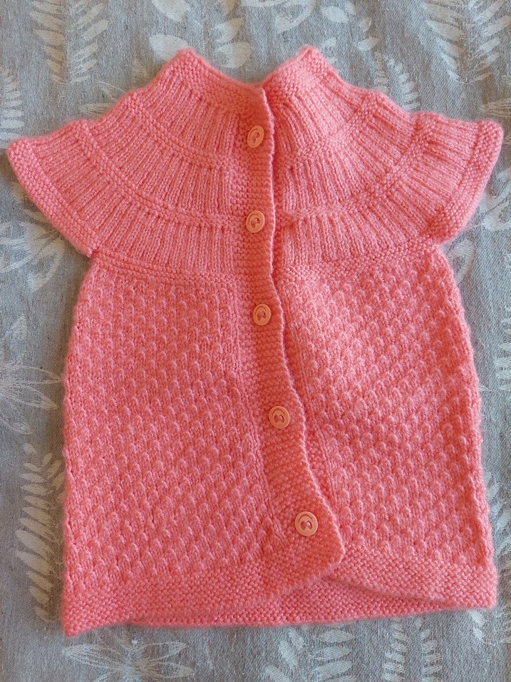 Yumuşak pembe örgüden yapılmış, kolsuz ve fitted kesim kız çocuk hırkası. Düğmeli ve dokulu örme deseni bulunur.