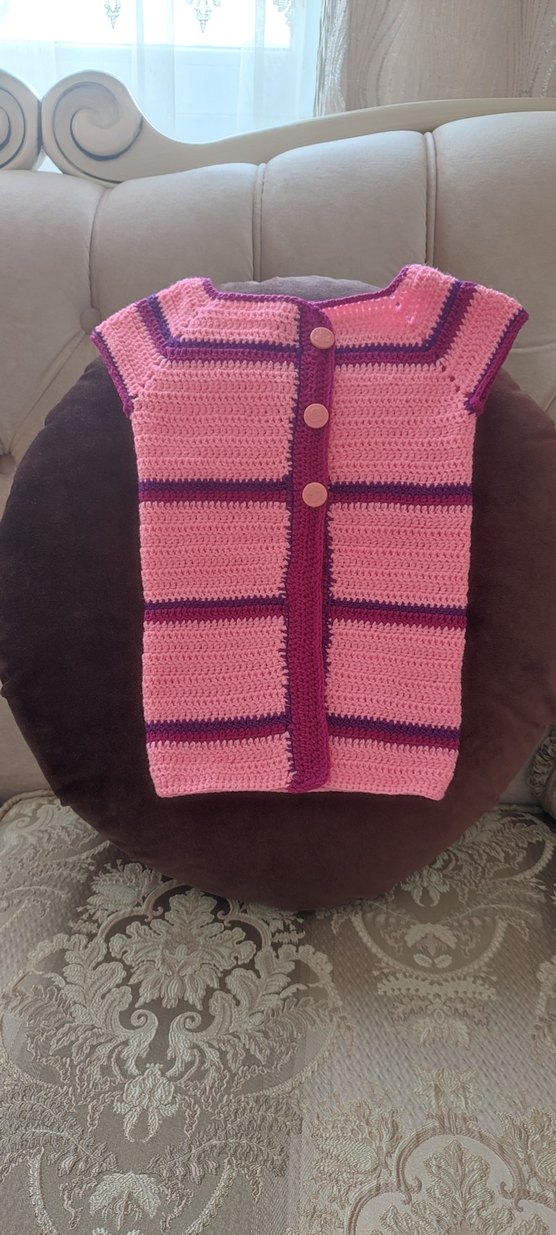 Pembe ve mor çizgili, düğmeli kolsuz örgü kız çocuk hırkası. Regular fit ve yumuşak örgü kumaştan yapılmıştır.
