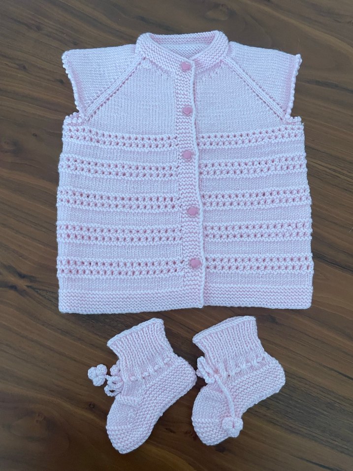 Pastel pembe, düğmeli ve kolsuz, düzenli kesim örgü hırka. Yanında uyumlu örgü bebek patikleri bulunur. Yumuşak ve sade tasarım.