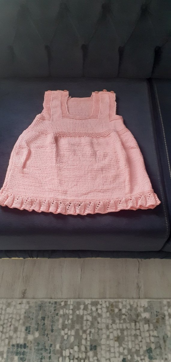 Pastel pembe renkli, kolsuz, yuvarlak yakalı, bol kesim kız çocuk örgü süveter. Etek ucu ince örgü detaylıdır.