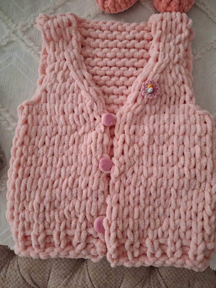 Fitted kesim, kolsuz, pastel pembe renkte yumuşak örme kumaştan yapılmış kız çocuk yeleği. Bohem tarzda, düğmeli ve desensiz dokusu vardır. Yeni örüldü.2ve 3 yaşa kadar uygun.adet fiyatı olarak