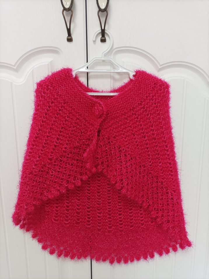 Renkli pembe kız çocuk pançosu, örgüden ve salaş kesimdedir. Askısız, kolsuz, sade desene sahip, bohem tarzda bir üründür.