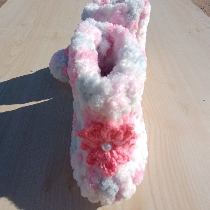 Kız çocukları için pastel pembe tie-dye desenli, yumuşak dokulu örgü sıcak ev terliği. Örgü çiçek detaylı, bohem tarzda.