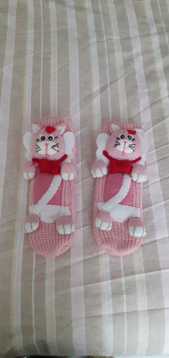 Kız çocukları için pembe örgü, nakışlı kedi desenli sıcak ev terliği. Yumuşak ve rahat kullanım sağlar.
