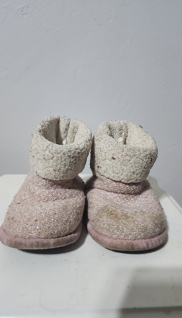 Kız çocukları için pastel pembe renkte, örgü ve yumuşak sıcak kumaştan yapılmış desensiz terlik.