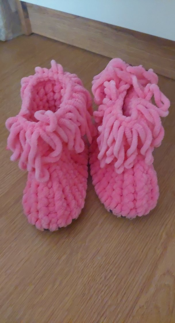 Kız çocuklar için pembe, örgü sıcak terlikler. Düz ve renkli, bohem tarzda, yumuşak ve rahat örgü kumaştan üretilmiştir.