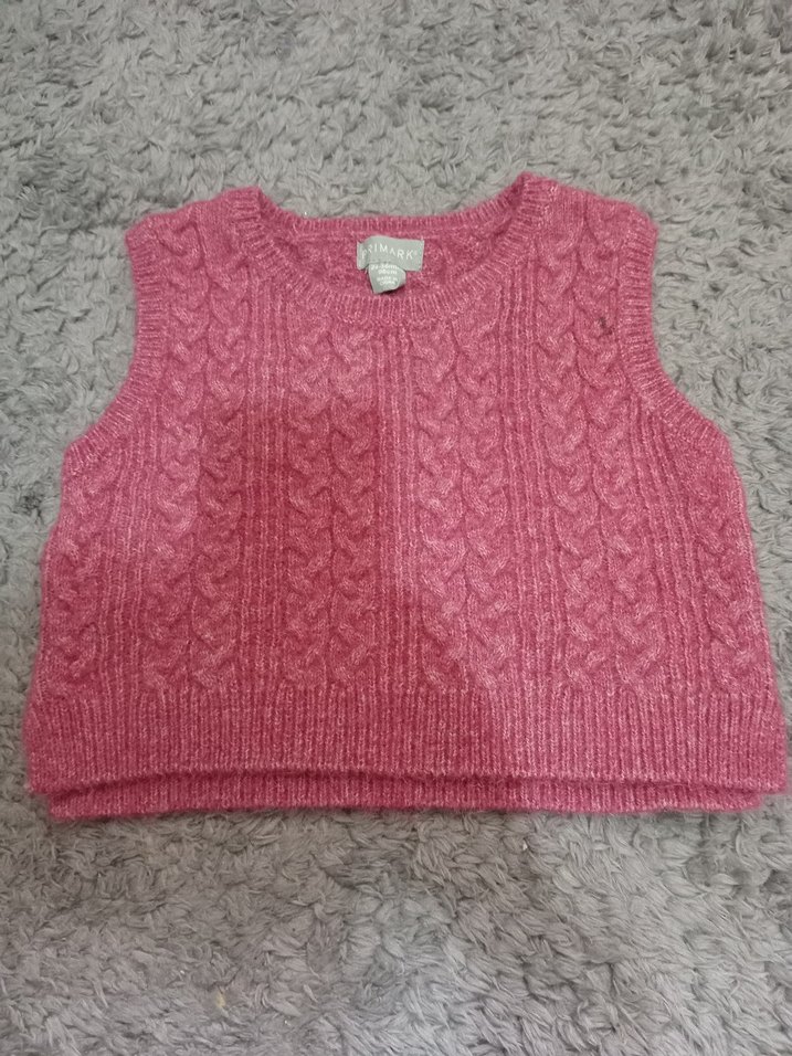 Kız çocuklar için pembe, örgü dokulu, kolsuz ve yuvarlak yaka, düz model süveter. Rahat ve sade tarzda, vücuda oturan kesim.