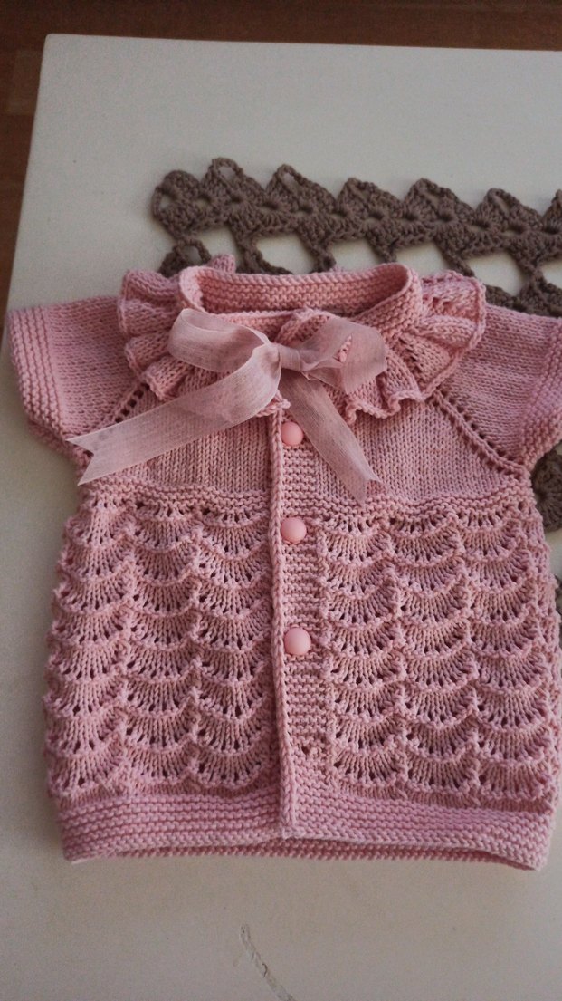 Kız çocuklar için pembe, kolsuz, vintage tarzda, dantel örnekli ve kurdele detaylı örgü hırka. Pastel renk yumuşaklık katıyor.