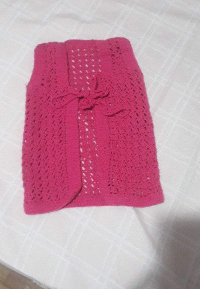 Pembe renkli, kolsuz kız çocuk yeleği, örgü dokusu ve tekne yaka detayına sahiptir. Düz ve desen içermeyen, bohem tarzda, vücuda oturan kesimlidir.