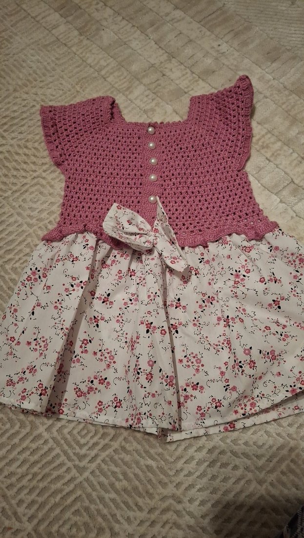 Pembe örme askısız üst kısmı, çiçek desenli bol etekle birleşen bohem tarzda kız çocuk elbisesi. İnci düğmeler ve fiyonk detayı bulunur. kendim yaptırdım hic kullanılmadı