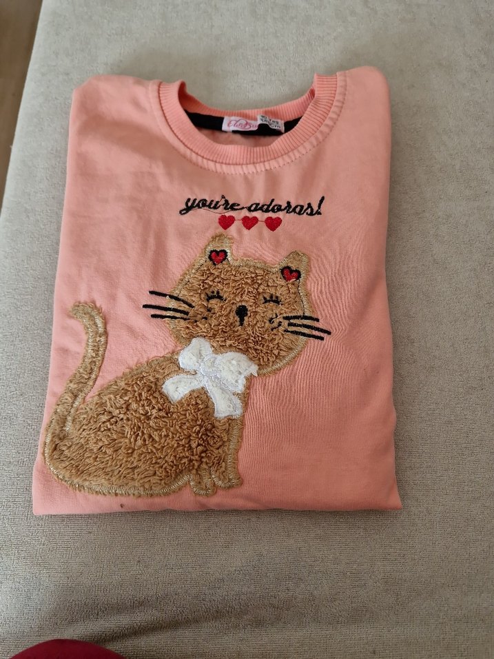 somon renkli, uzun kollu ve yuvarlak yaka kız çocuk sweatshirtü. pamuklu kumaş üzerine peluş kedi baskısı Yeni gibi sadece son eklediğim resimde küçük bir boyamı bilmiyorum ne olduğunu aldıgımdada vardı kolun alt kısmına geldiği için görünmüyor başka bir sorunu yok pamuklanma falan yok