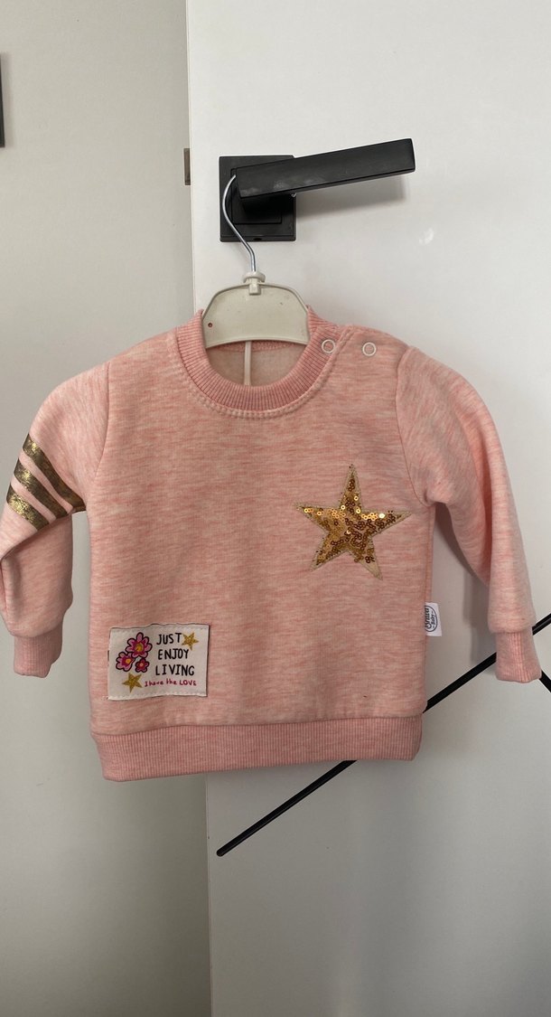 6 aya uygun üstünde 9 yazıyor ama içi yünlü olduğu için 9 aya uygun değil hiç kullanılmadı etiketi yok ama sadece yıkadım bir kere Pembe, uzun kollu, yuvarlak yakalı kız çocuk sweatshirtü, yumuşak ve sıcak kumaştan örme dokuda. Üzerinde baskılı yıldız ve "JUST ENJOY LIVING" yazılı bir patch bulunur. ⭐