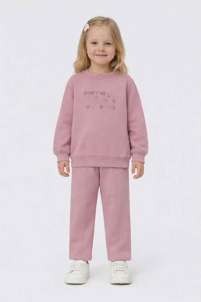5-6 yaş. Kompak kumaş.Pembe renkli, oversize kesim kız çocuk eşofman takımı. Uzun kollu, yuvarlak yaka, rahat ve yumuşak kumaşla 'DON'THE' yazılı sade tasarım sunar.