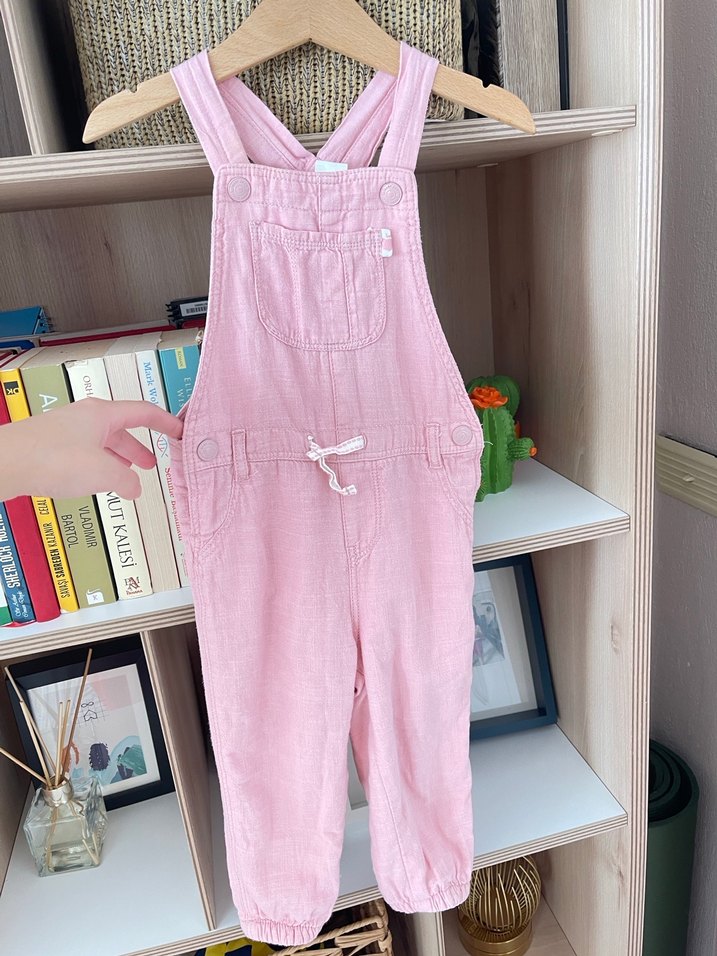 Kız çocukları için pamuklu, pembe, askılı ve kemerli detaylara sahip bol kesim tulum. Pastel tonlarda, sade tasarım.