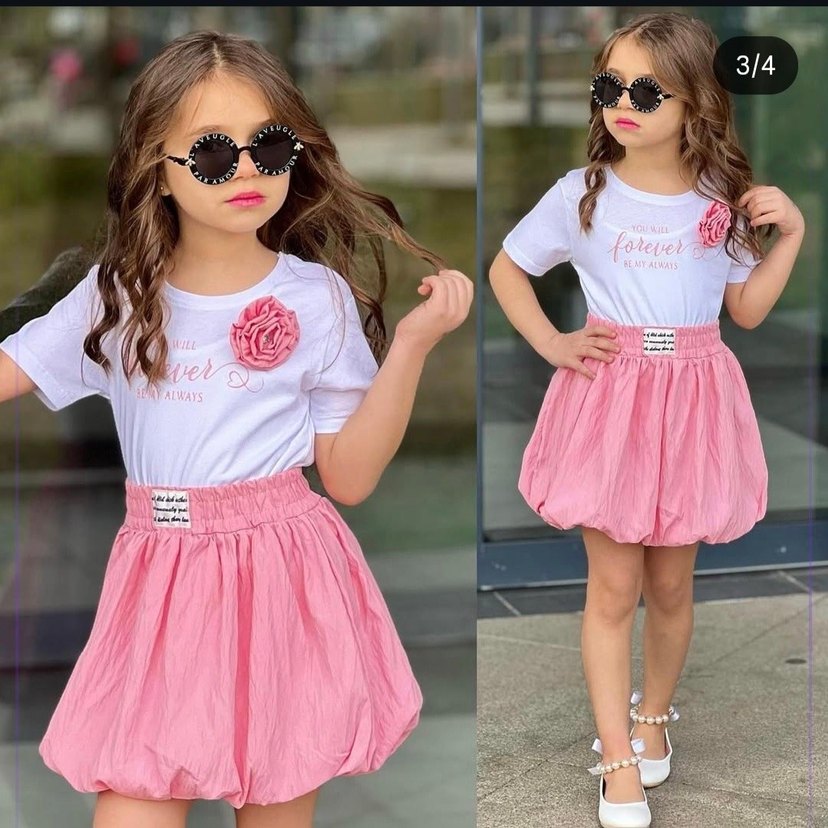 Kız çocuk etek bluz, kısa kollu ve pamuklu salaş kesimdir. Pastel pembe bağlama desenli etek ve fırfır detaylı, askısız yaka bulunur. Üstünde "forever" yazısı vardır.