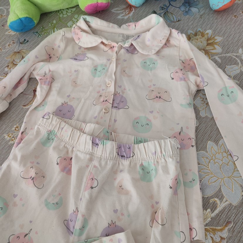 Pembe pamuklu kız çocuk pijaması, düğmeli ön, kısa kollu ve yakalı. Pastel tonlarda baskılı, rahat ve yumuşak uyku kıyafeti. ️