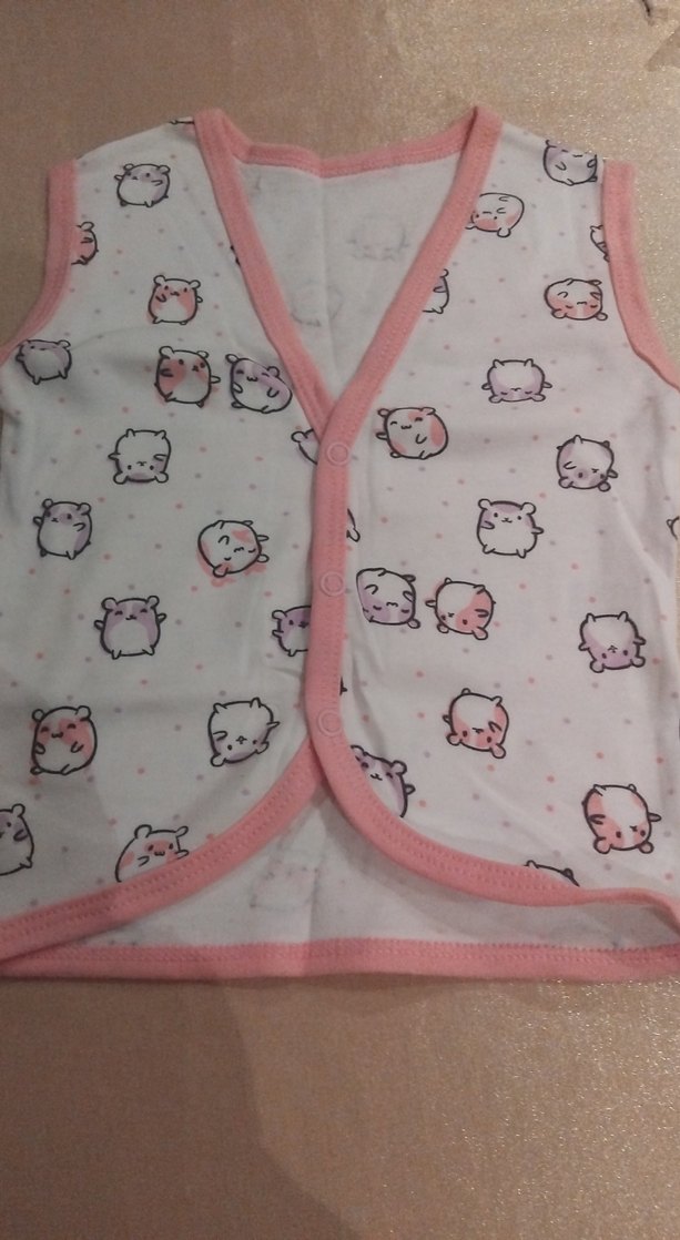 Pamuklu, çıtçıtlı V yaka ve kolsuz, pastel pembe kenarlıklı, baskılı kız çocuk yeleği. hijyen nedeniyle iade kabul olmamaktır