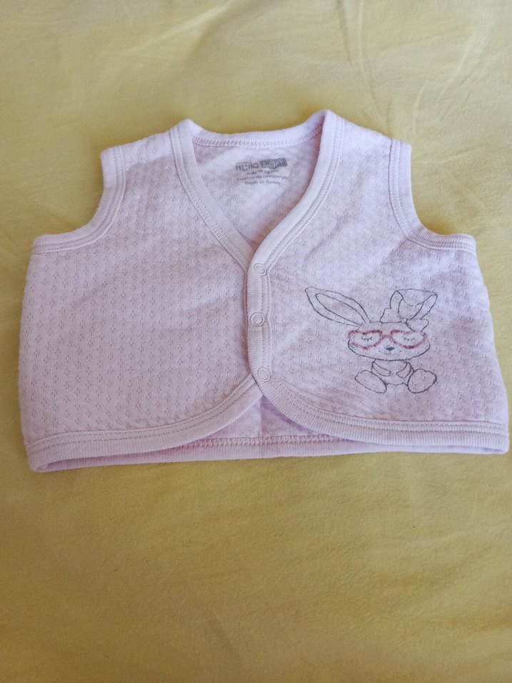 Pamuklu, düğmeli, bisiklet yaka, işlemeli tavşan desenli pembe kız çocuk yeleği. Fitted kesim ve kolsuz tasarım.