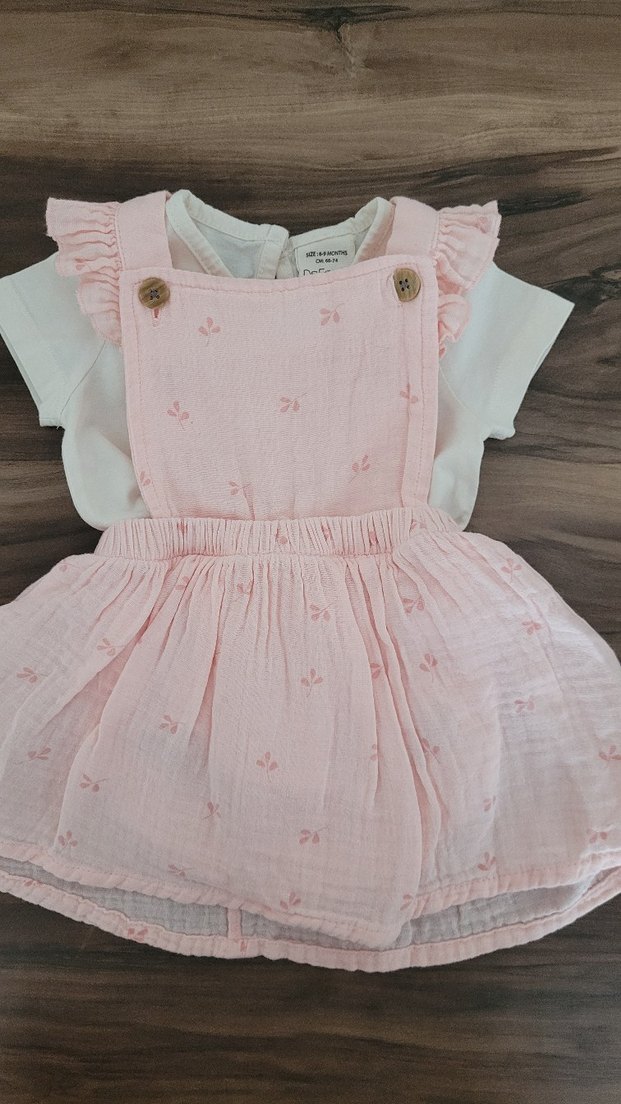 Yumuşak pamuktan yapılmış kız çocuk elbisesi. Kısa kollu tişortle birlikte. 6-9 ay. Yıkandı sadece hiç kullanılmadı sıfır ayarında