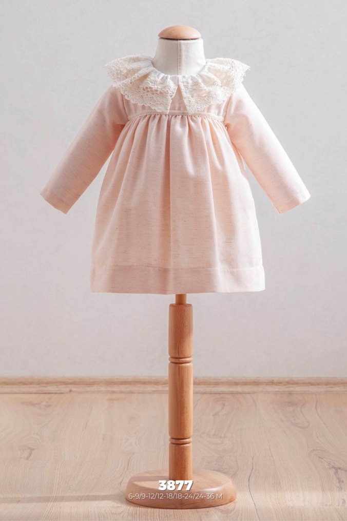 Pembe pamuklu kız çocuk elbisesi, uzun kollu, yakalı ve fırfır detaylıdır. Nakışlı desenlere sahip, modern klasik tarzda ve regular fit. Her beden mevcut