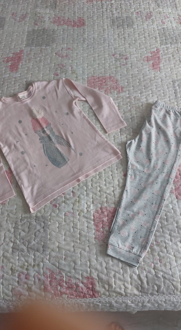 Kız çocukları için uzun kollu, bisiklet yaka, baskılı pembe üst ve desenli açık renk pantolonlu pamuklu, örme pijama takımı. #zara, tertemiz pijama, ev kıyafeti.