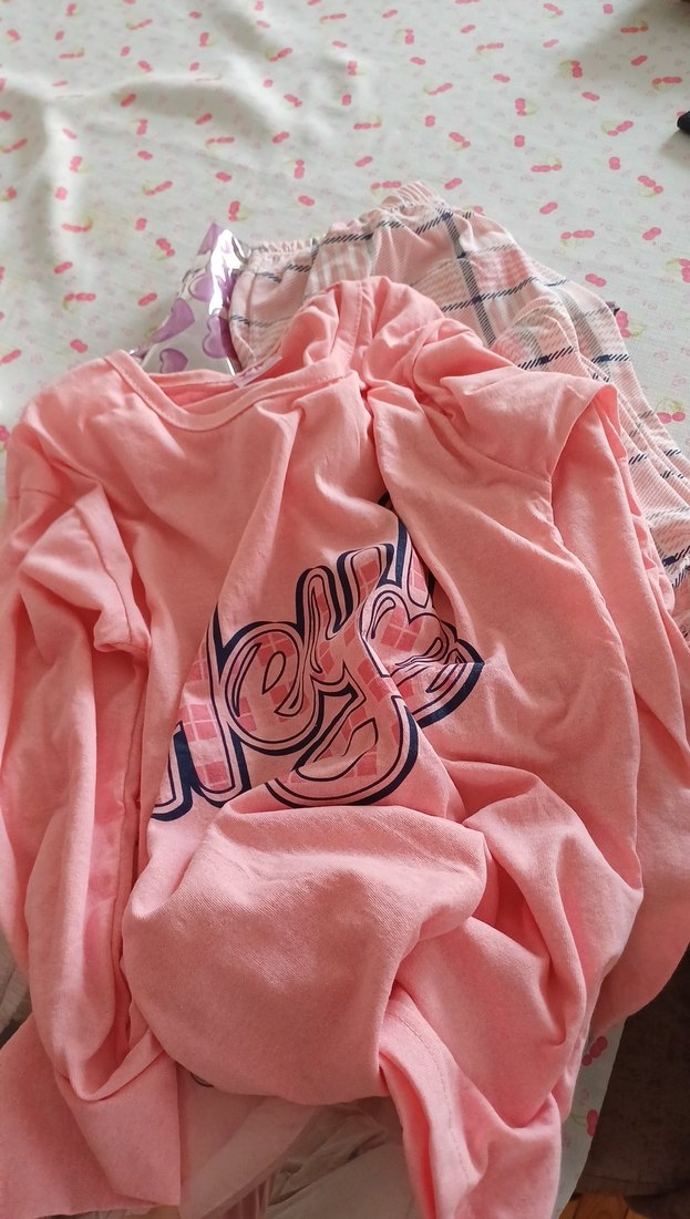 Kız çocukları için pastel pembe renkte, uzun kollu ve bisiklet yaka pamuklu pijama takımı. Üst kısmı baskılı, rahat dökümlü kesime sahip.
