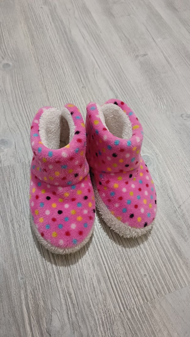 Kız çocukları için renkli puantiyeli, yumuşak pembemsi kumaştan, sıcak ve örme iç yüzeyli terlikler. Rahat, dokulu tabanlara sahiptir. Temiz üründür
