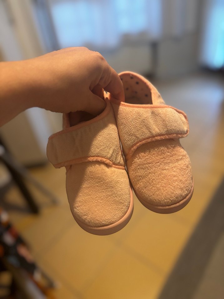Kız çocukları için pembe renkli, yumuşak kumaşlı ve kauçuk tabanlı sıcak terlikler. Kolay kapanan Velcro bantlı, pastel tonlarda sade tasarım.