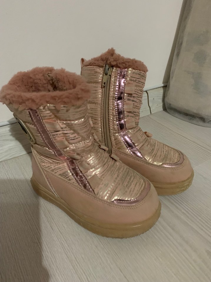Kız çocuklar için pembe parlak kauçuk botlar, kürk detaylı ve yan fermuarlı. Sıcak tutar, sokak stili için uygun.