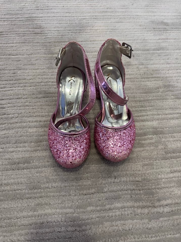 Kız çocuklar için pembe parlak simli, kaymaz tabanlı ve bantlı topuklu ayakkabı.