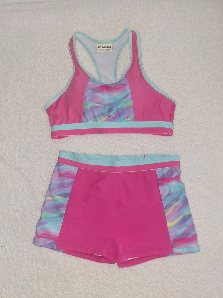 Kız çocukları için pembe ve mavi tonlarında pastel batik desenli, kolsuz spor bikini üstü ve şort takımı.