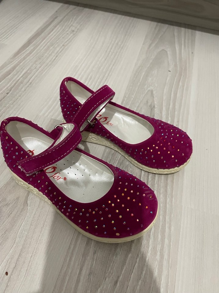 Kız çocukları için pembe renkli, payetli nakış detaylı, kauçuk tabanlı klasik babet ayakkabılar. Kayışlı tasarımıyla rahat kullanım sağlar.